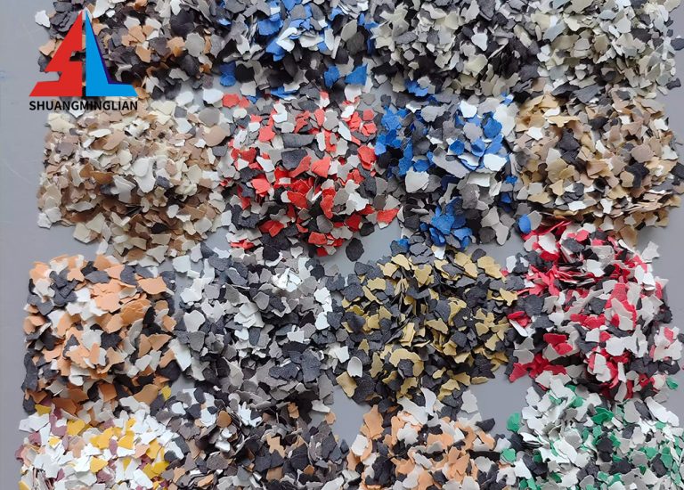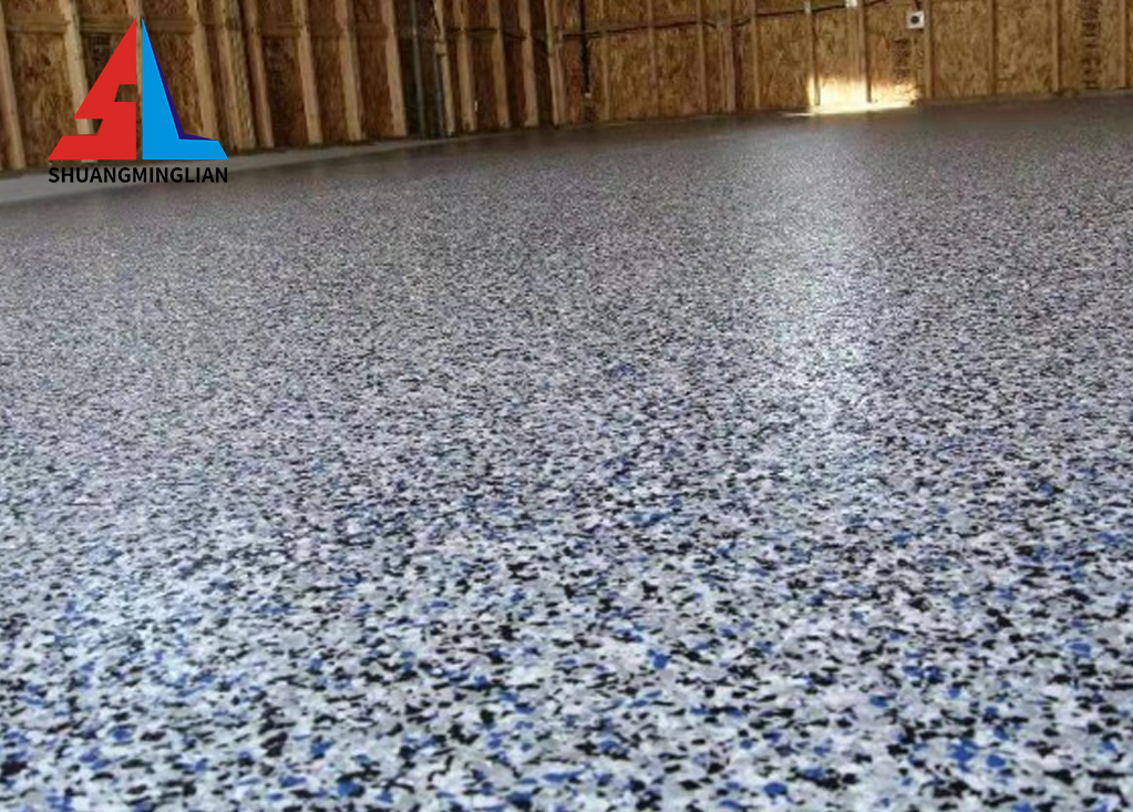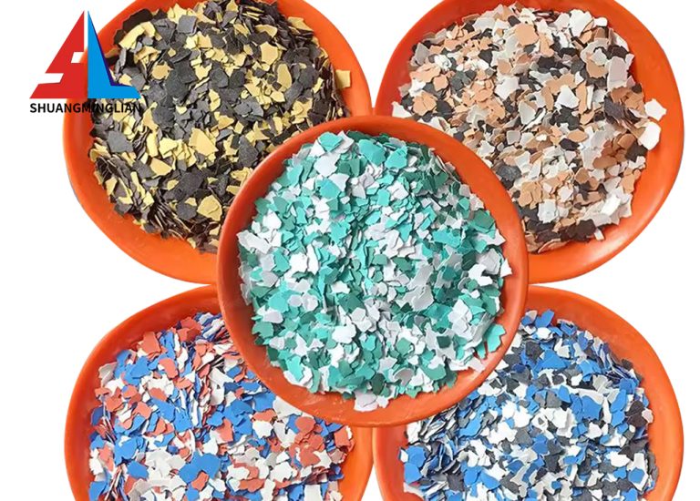 Pattern layer: A mixture of colored flakes and transparent epoxy resin, forming the visual centerpiece of the floor.
